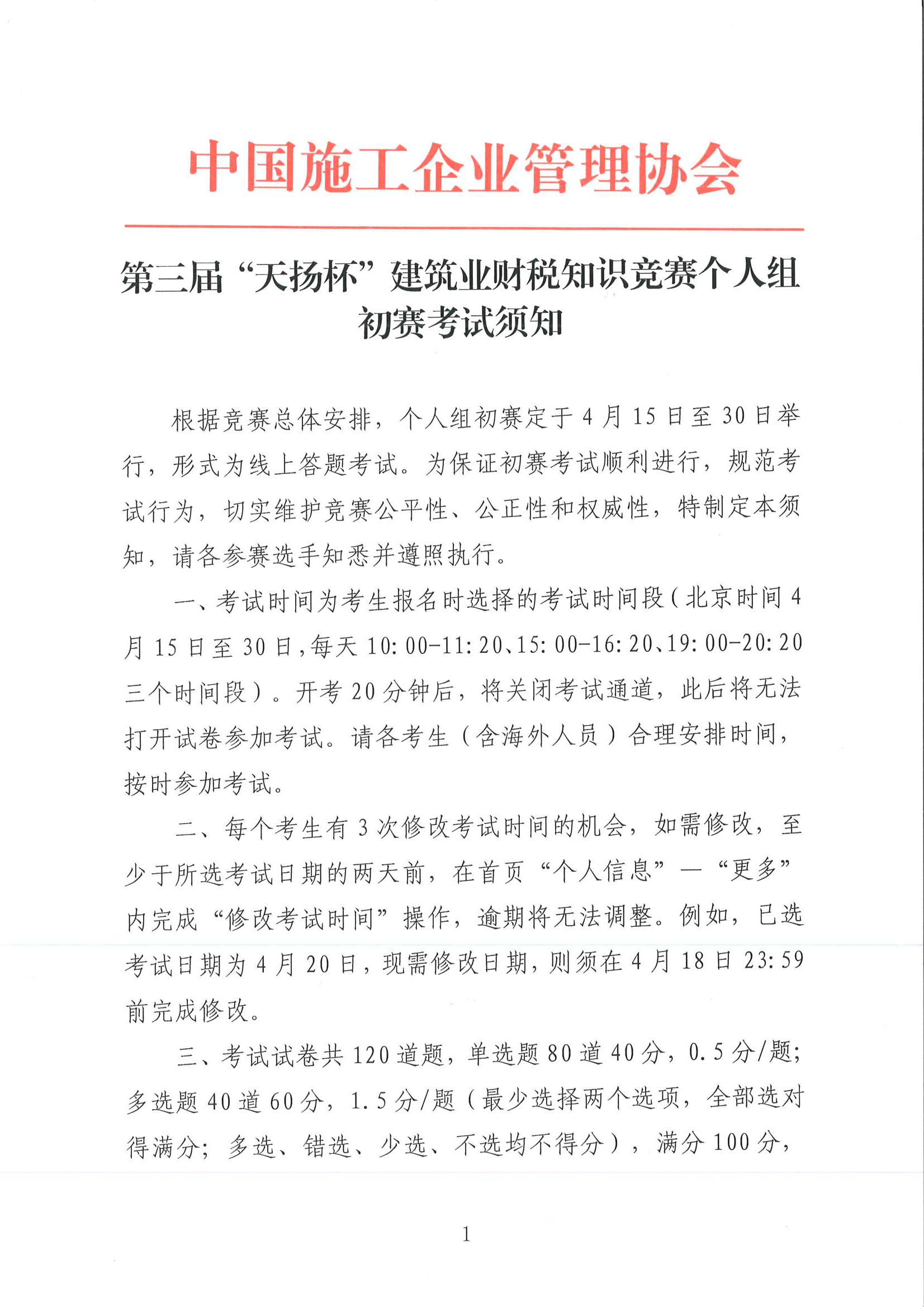 【初赛考试须知】第三届“天扬杯”建筑业财...