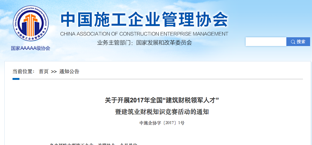 【中国施工企业管理协会】关于开展2017年全国“建筑财税领军人才” 暨建筑业财税知识竞赛活动的通知